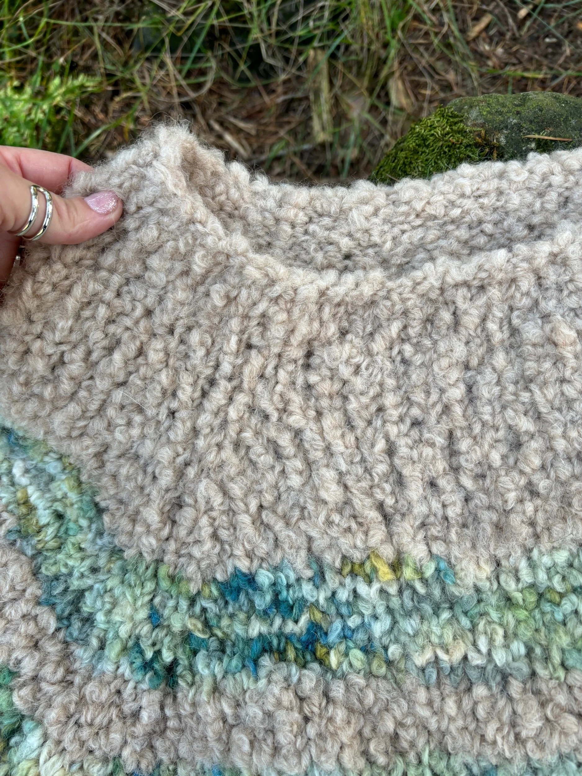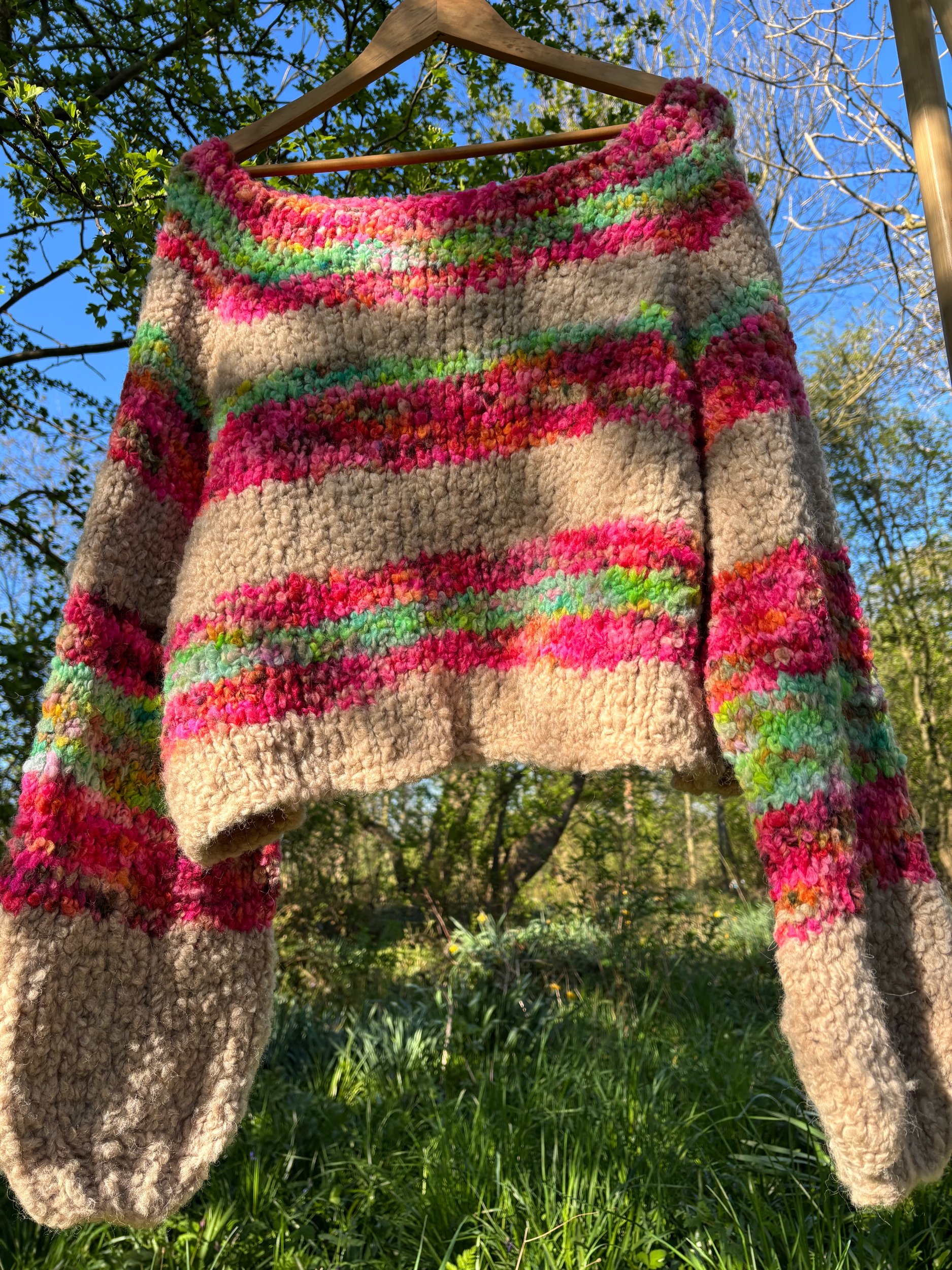 Boucle is an arty, imperfect yarn by nature. Full of loops and softness rather than sharp stitch definition. Your finished sweater may come out slightly different in size depending on your tension and yarn choice, and that’s all part of the handmade beauty
