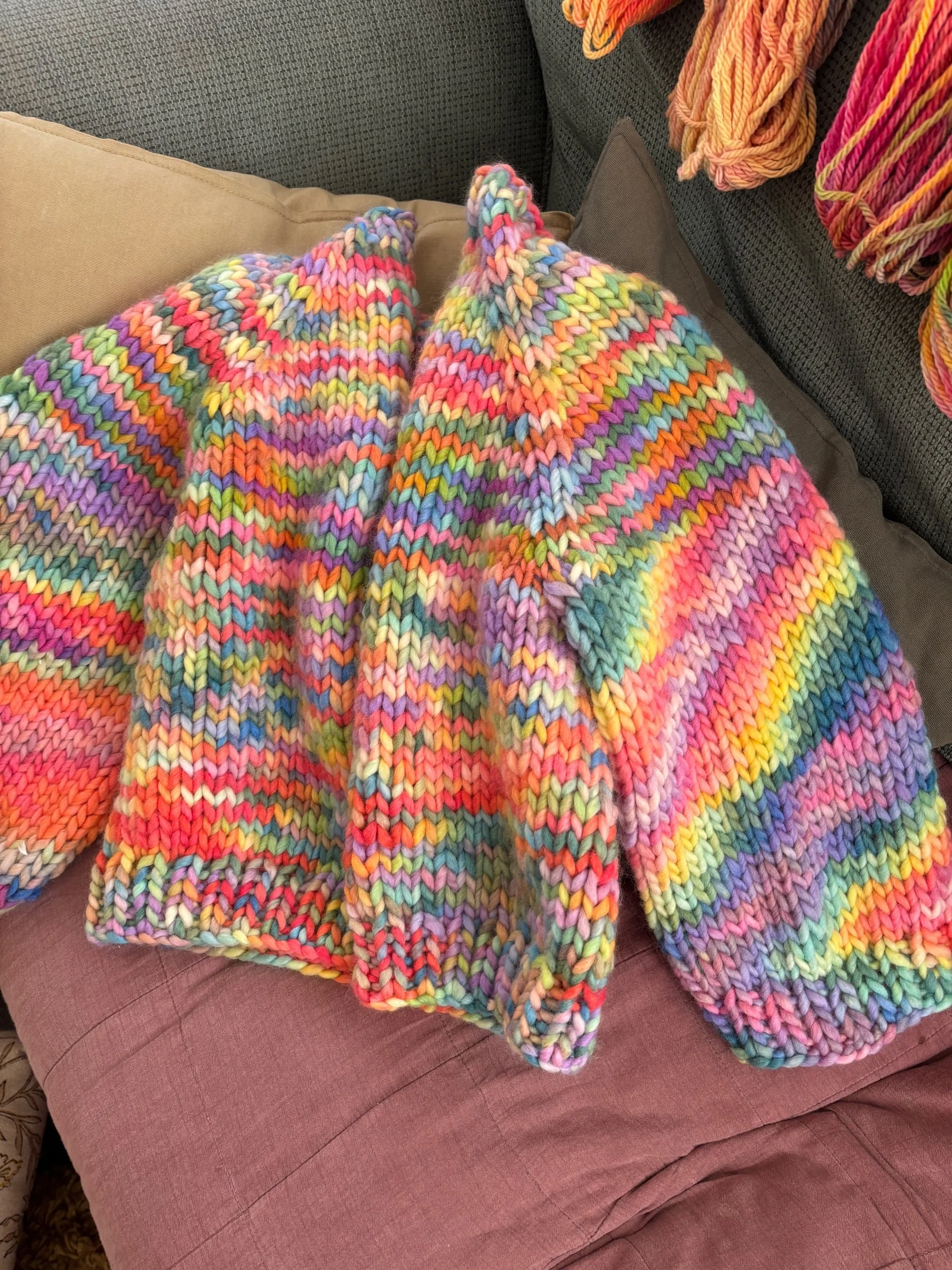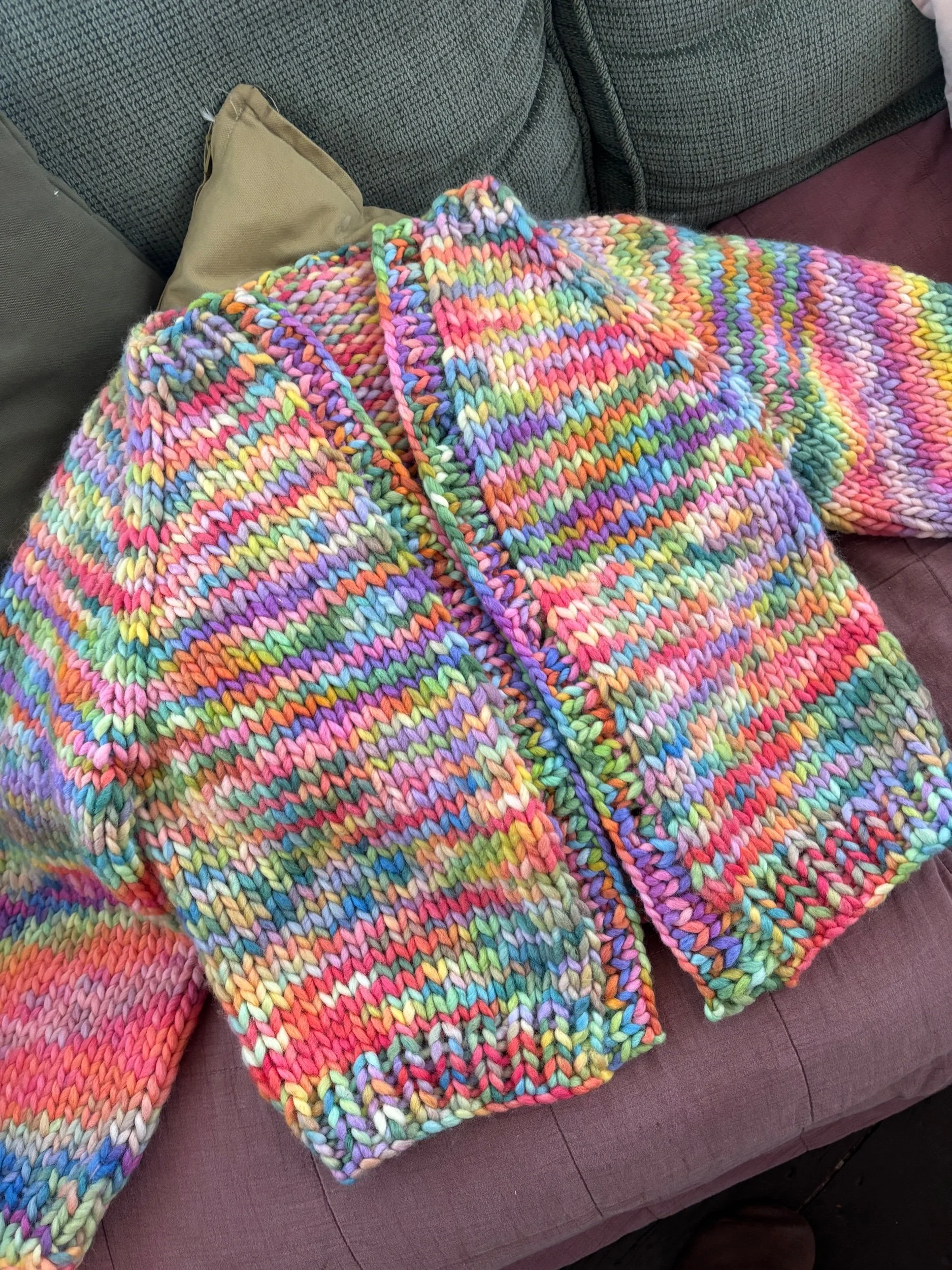 You can knit it using various strands of yarn held together, or one strand of super chunky. The result is the same, a thick, squishy cardigan that works up fast and feels like a warm hug.